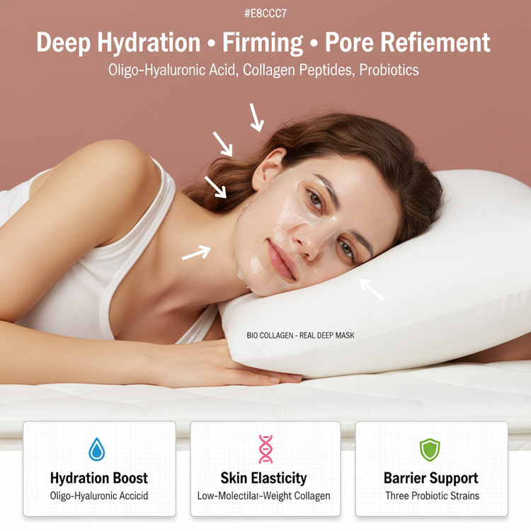 Bio Collagen-Real Deep Mask delivers intense moisture with oligo-hyaluronic acid and lightweight collagen peptides to refine pores and firm skin. Three probiotic strains work beneath the surface, strengthening your barrier to fight premature aging. Hypoallergenic and free of 19 harsh additives, it’s perfect for sensitive or reactive skin and safe for pregnancy and breastfeeding.
